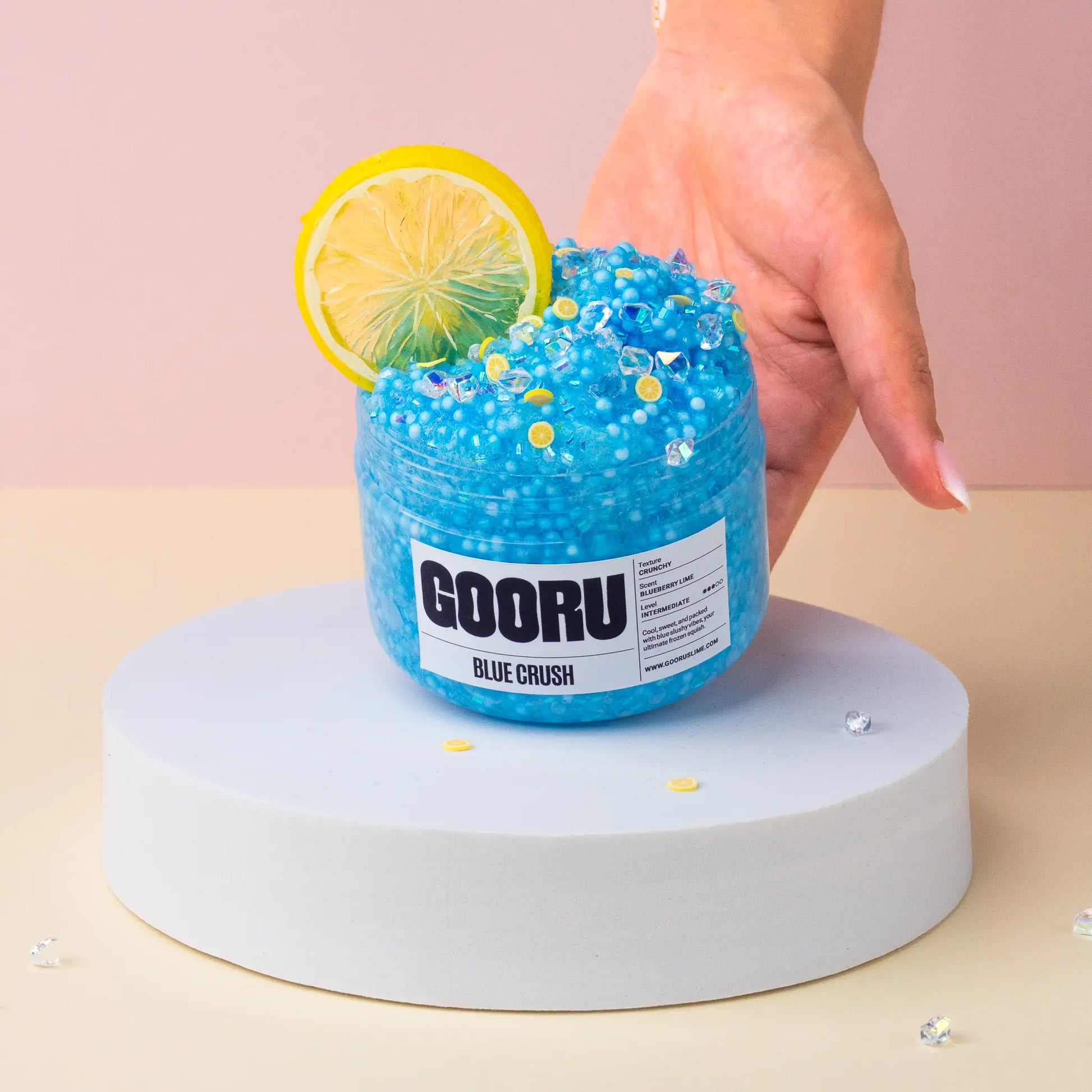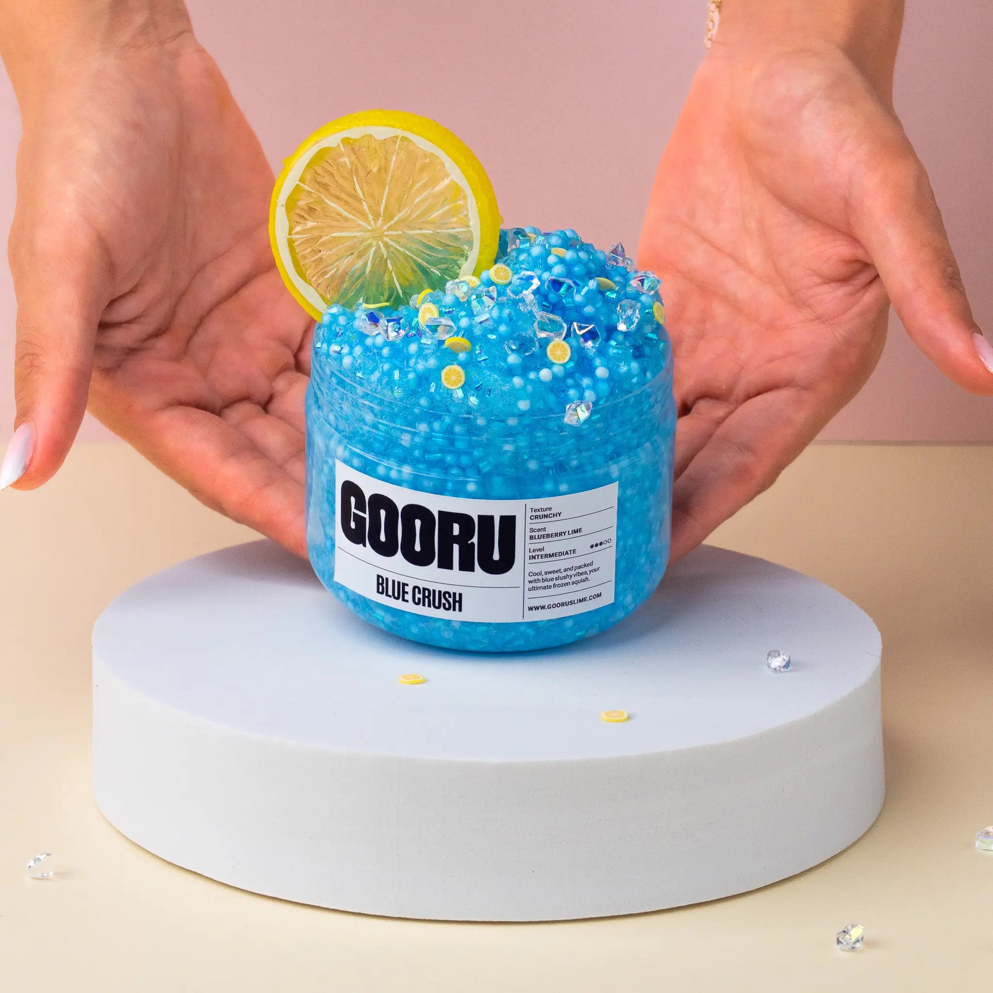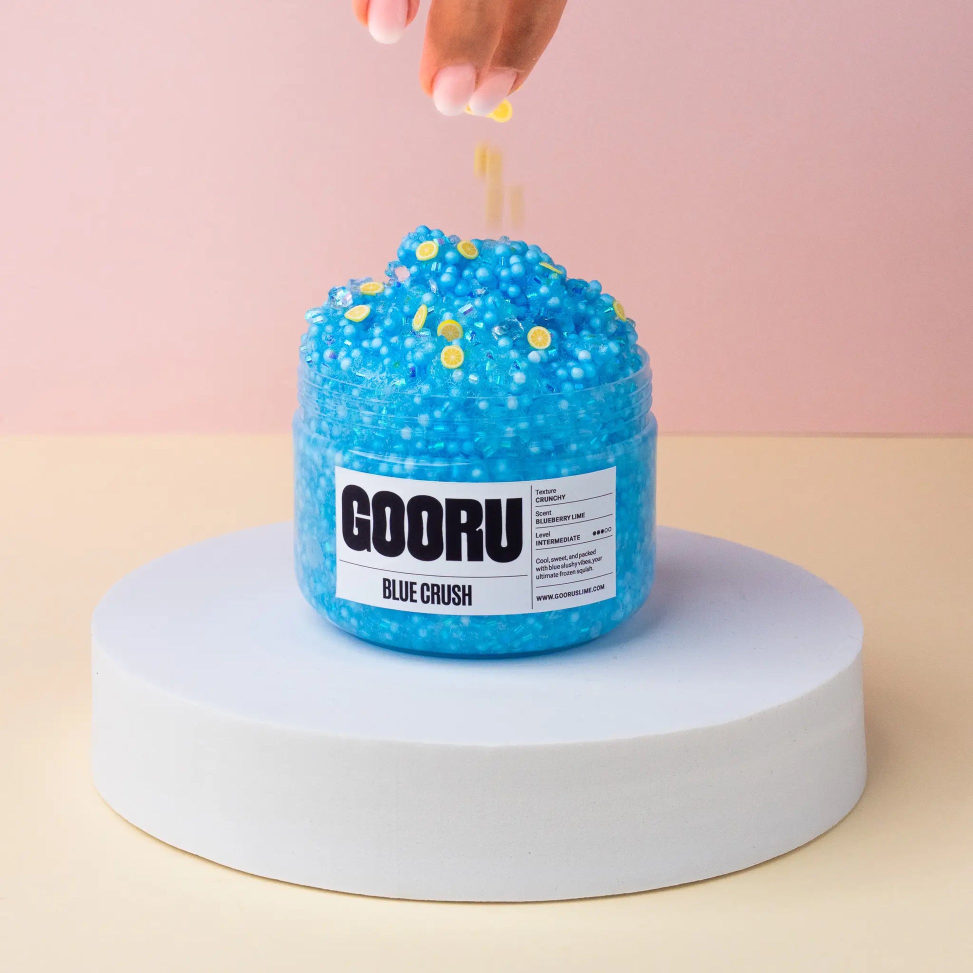 Crunchy blue slime with citrus scent and lemon charms. Frozen drink inspired texture for fruity slime fans.