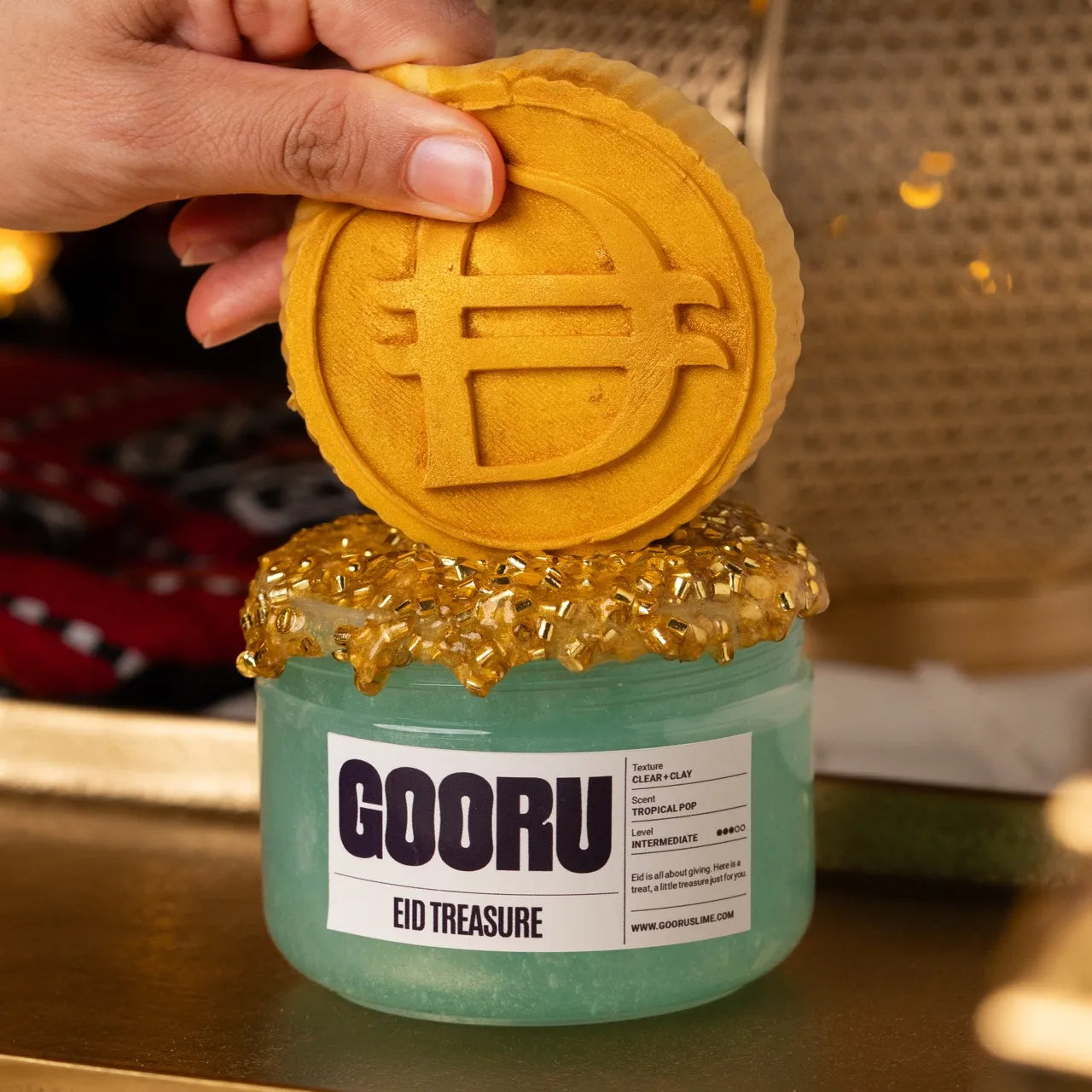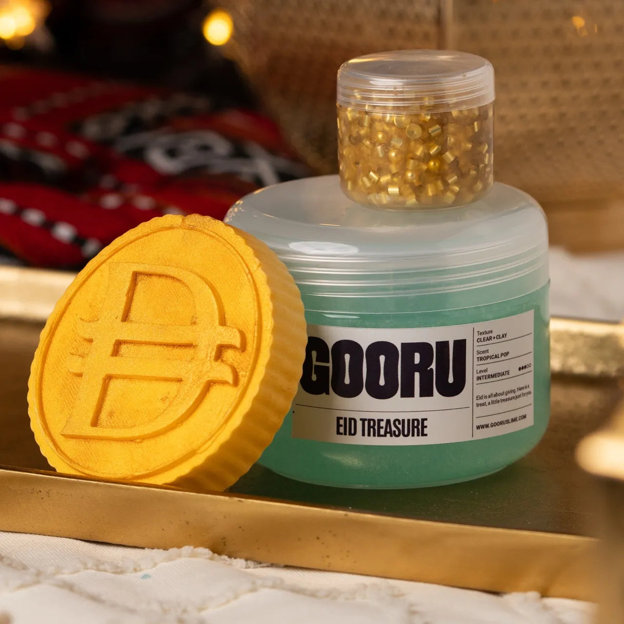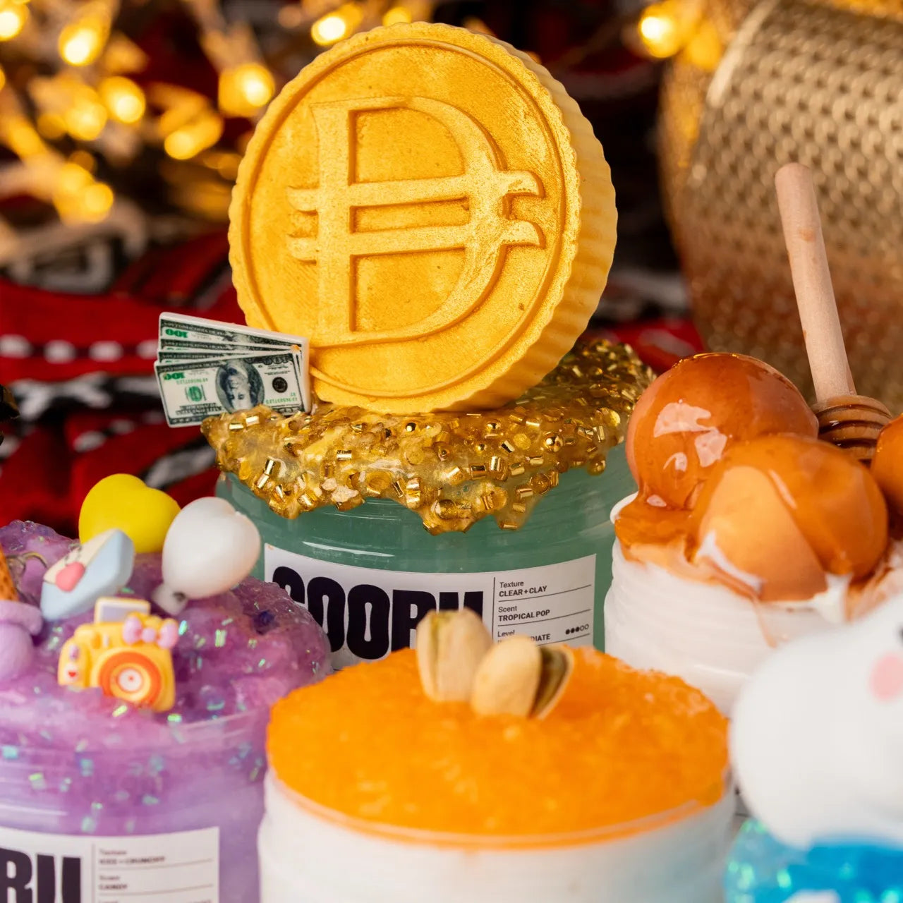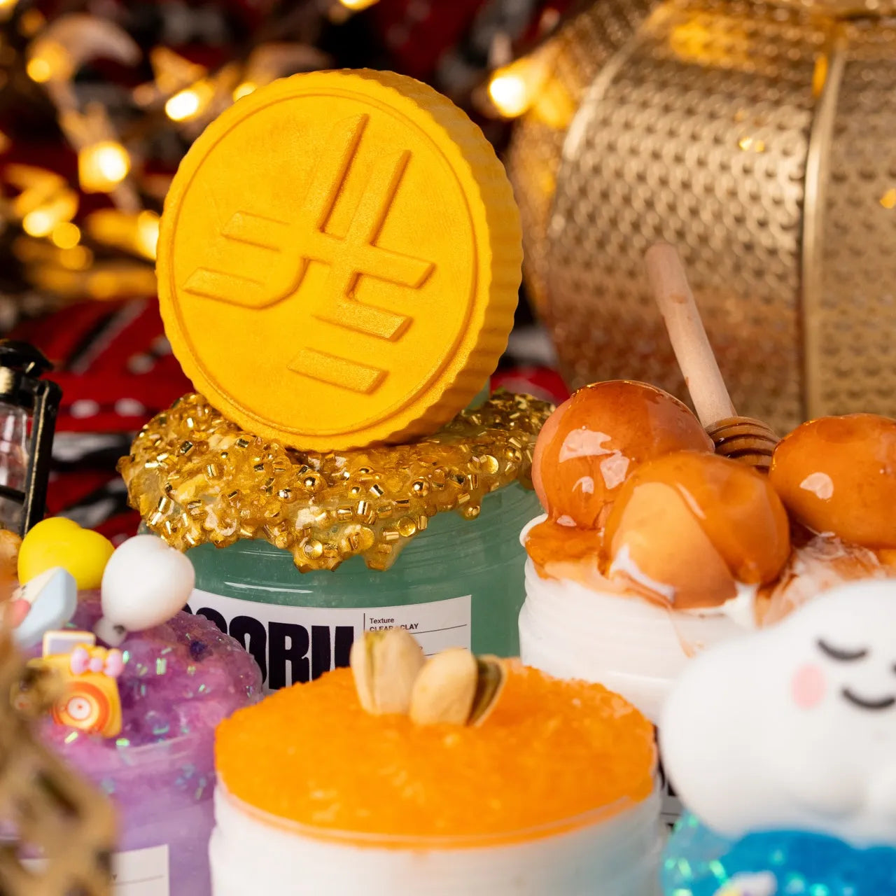 Eid Treasure is a clear and clay slime with tropical pop scent, golden glitter bingsu toppings, and two coin topper options.