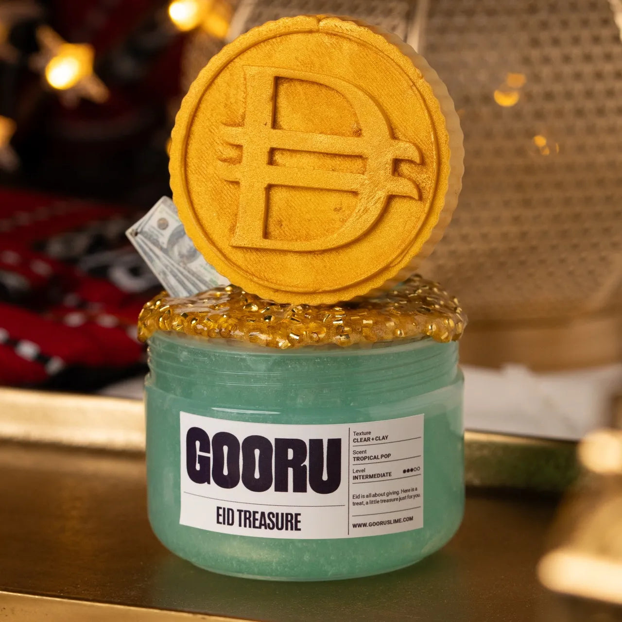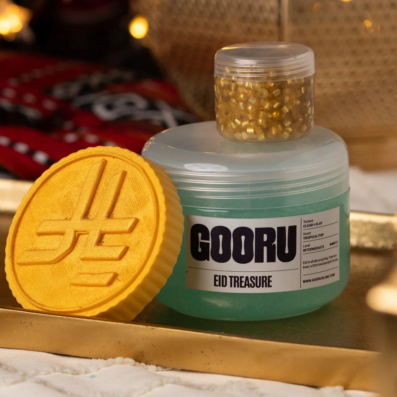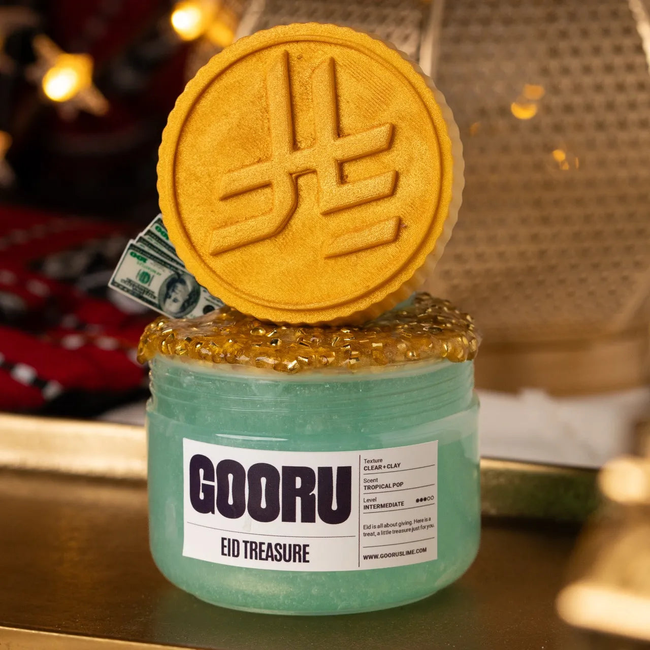 Eid Treasure is a clear and clay slime with tropical pop scent, golden glitter bingsu toppings, and two coin topper options.