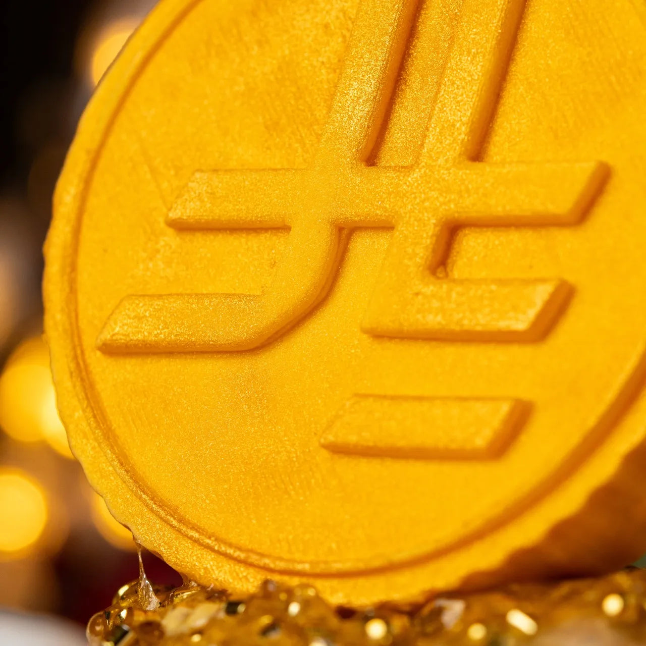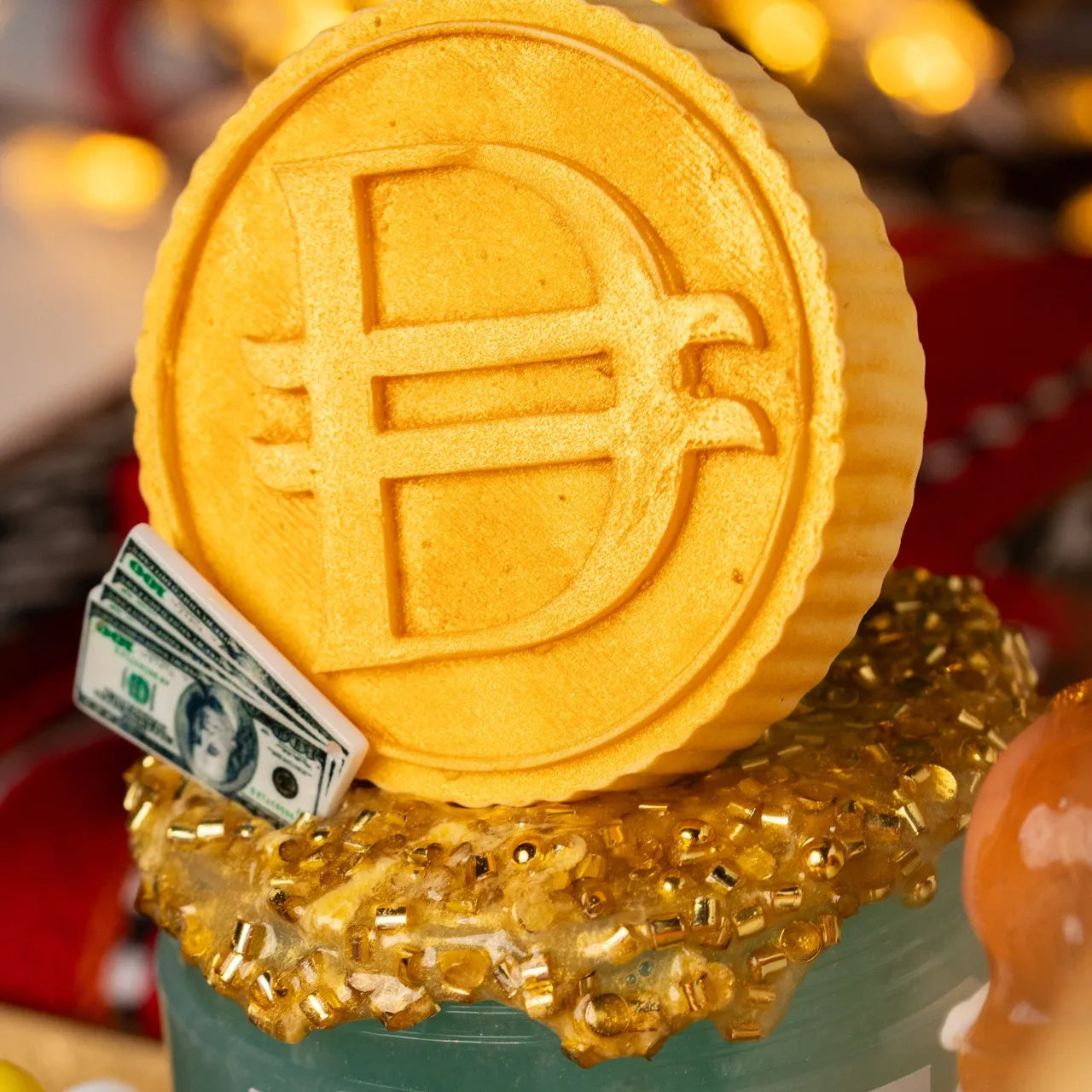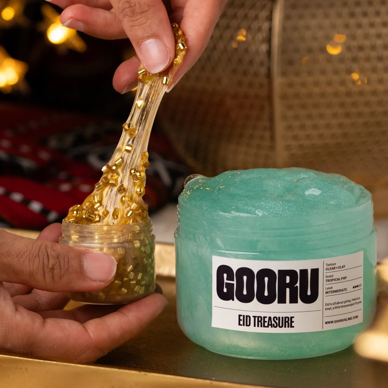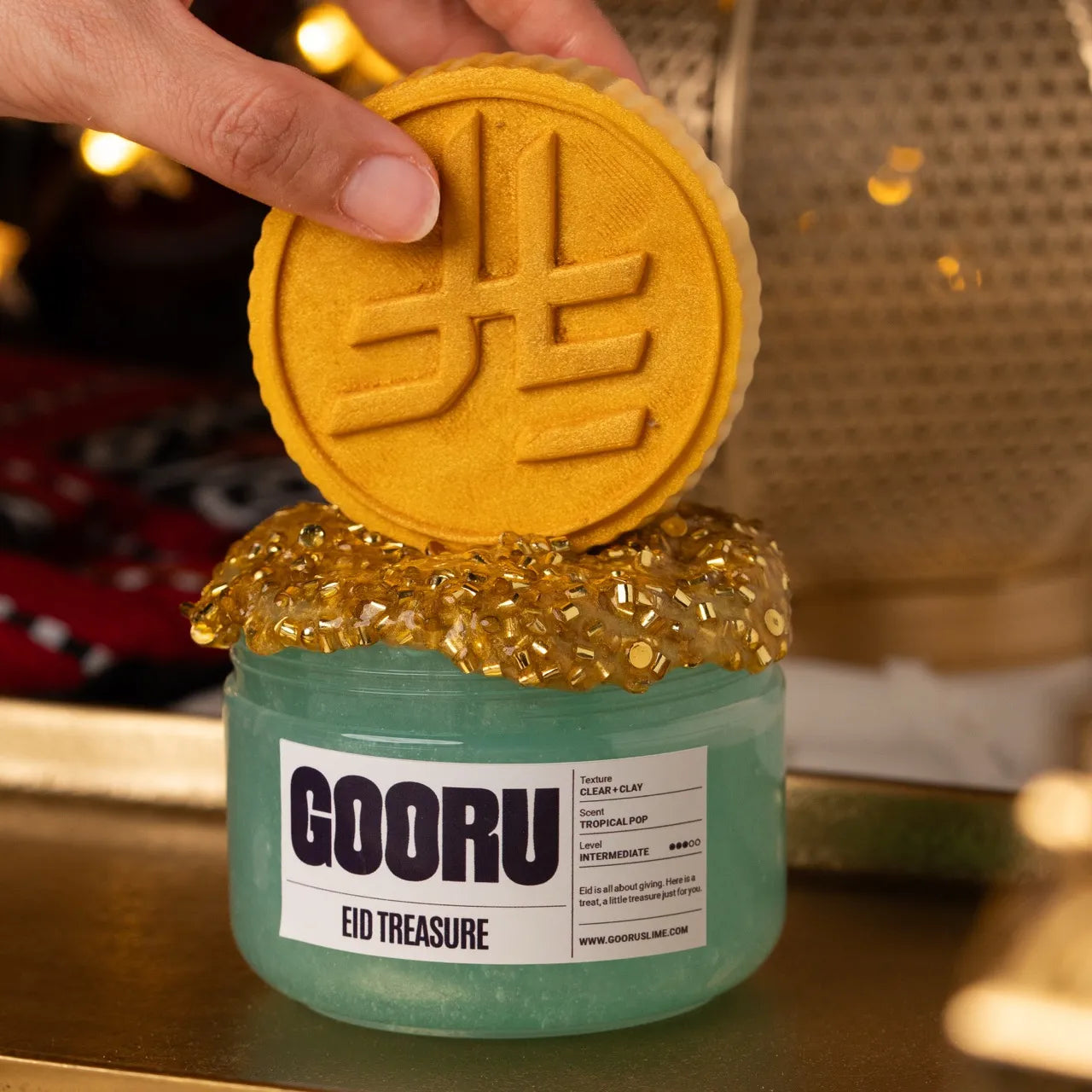 Eid Treasure is a clear and clay slime with tropical pop scent, golden glitter bingsu toppings, and two coin topper options.