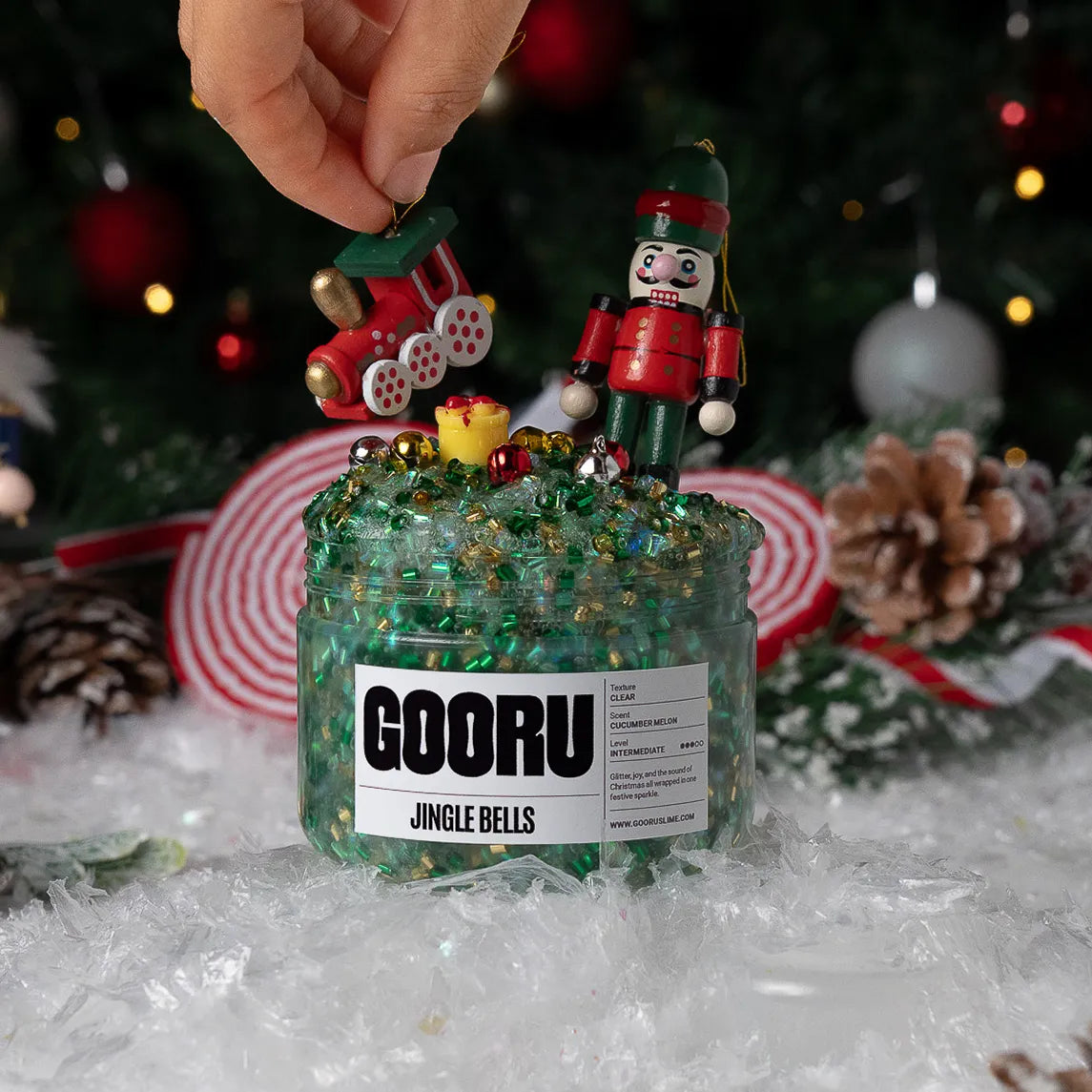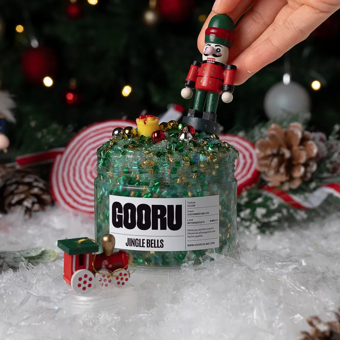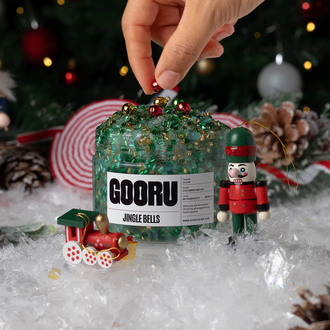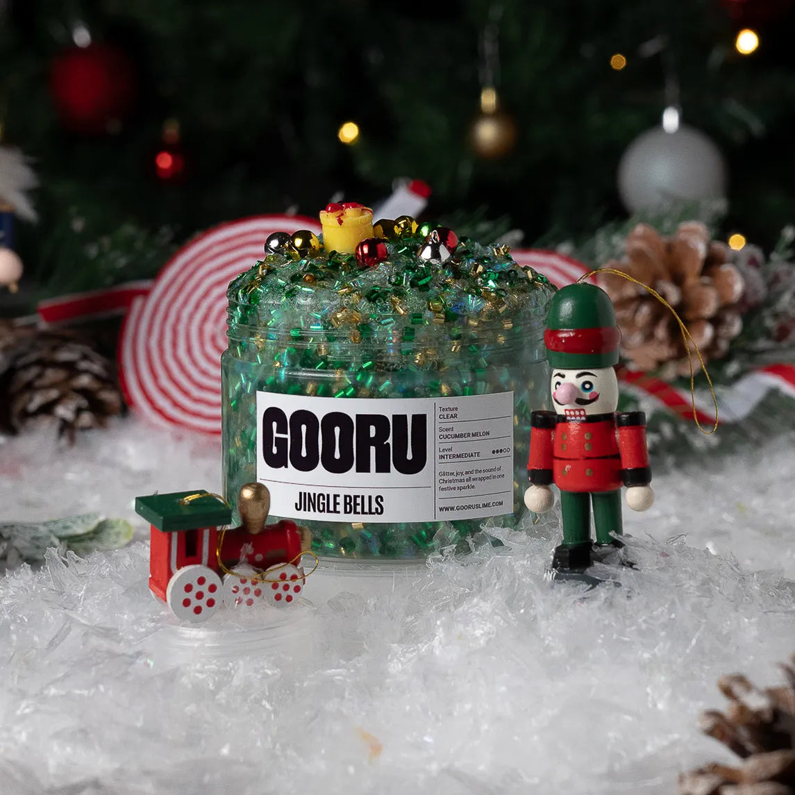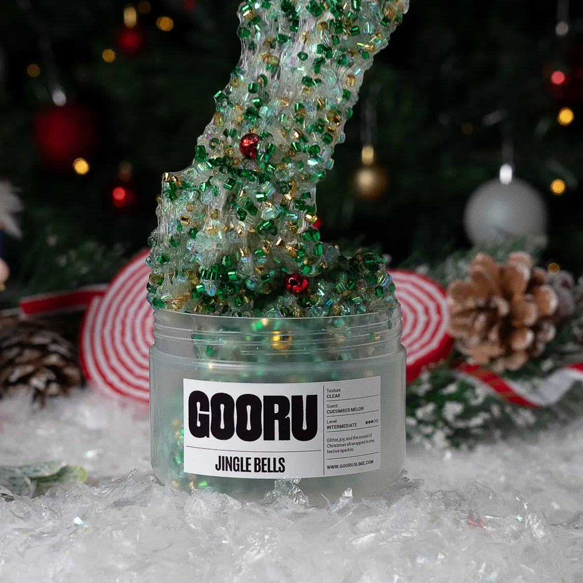 Jingle Bells is a glittery crunchy slime with cucumber melon scent and holiday sparkle in every squish.