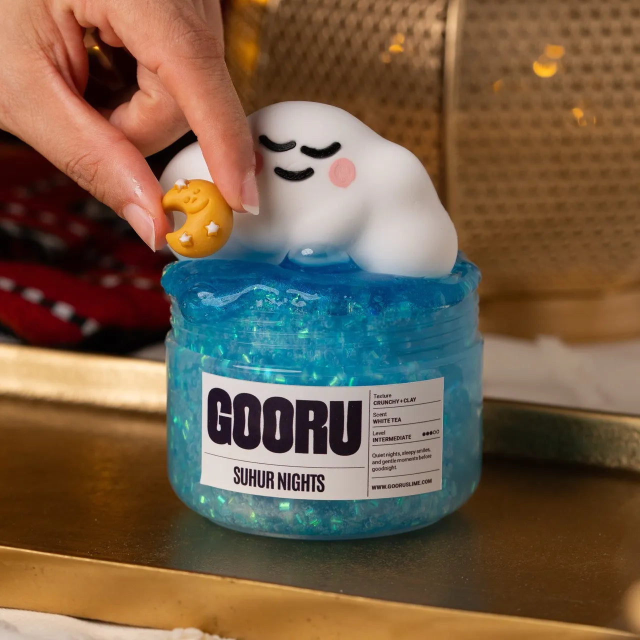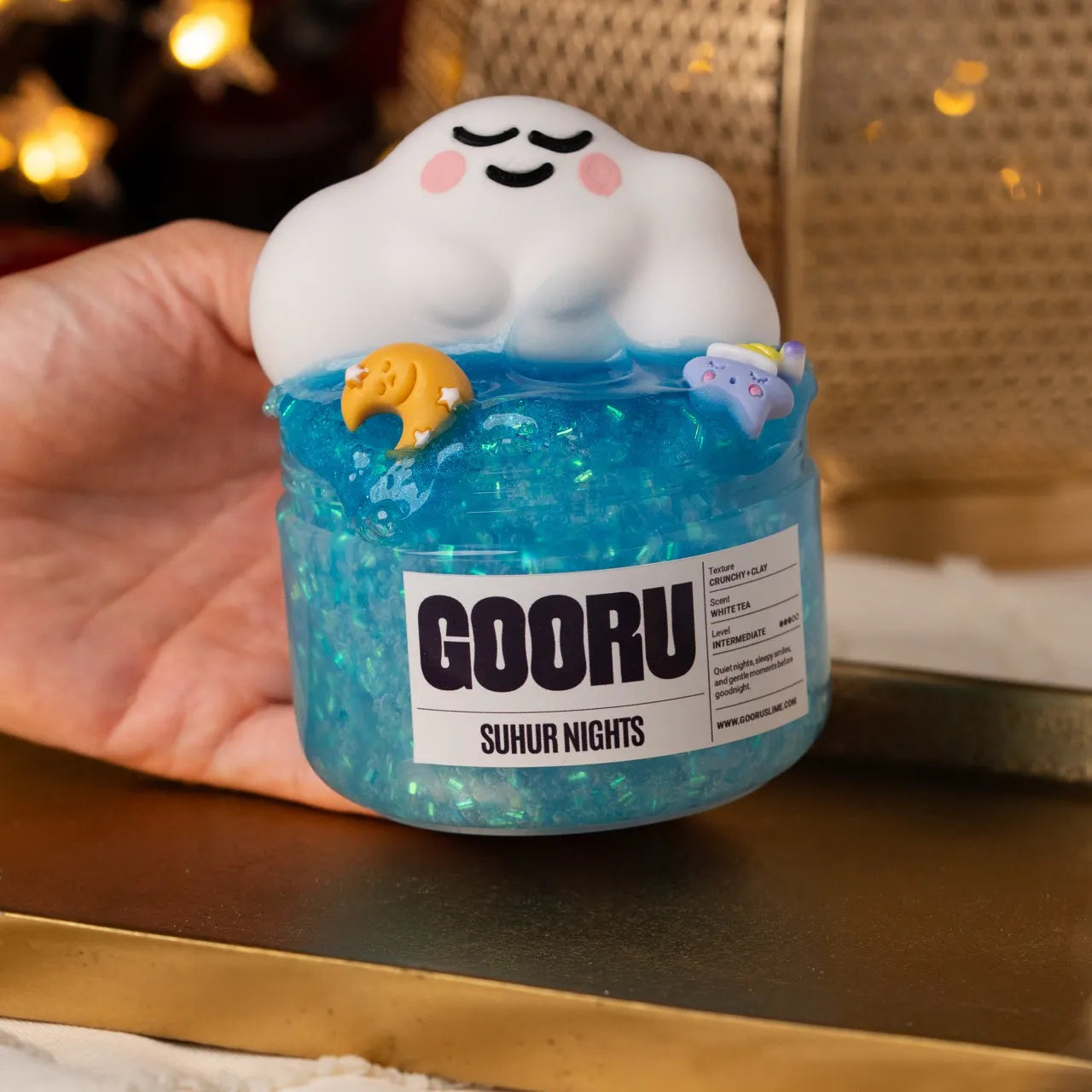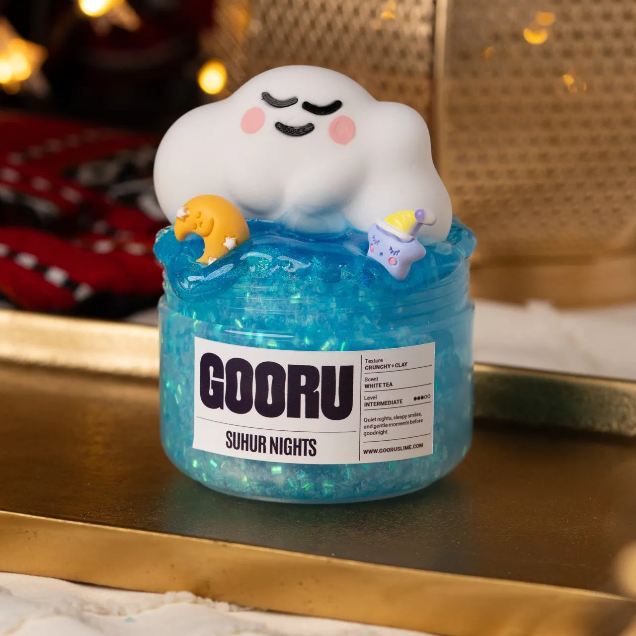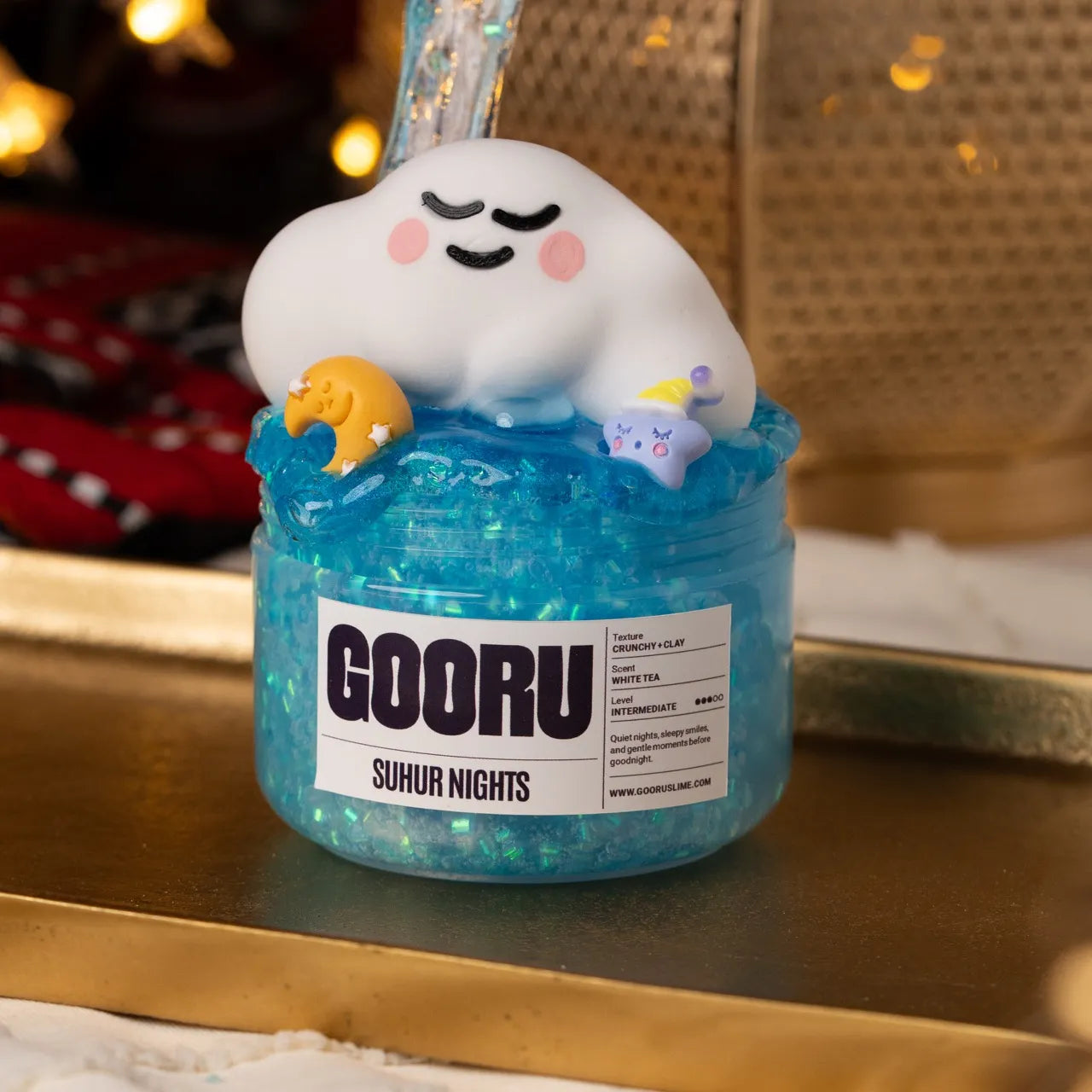 Suhur Nights is a crunchy and clay slime with white tea scent and dreamy suhoor-inspired toppers.