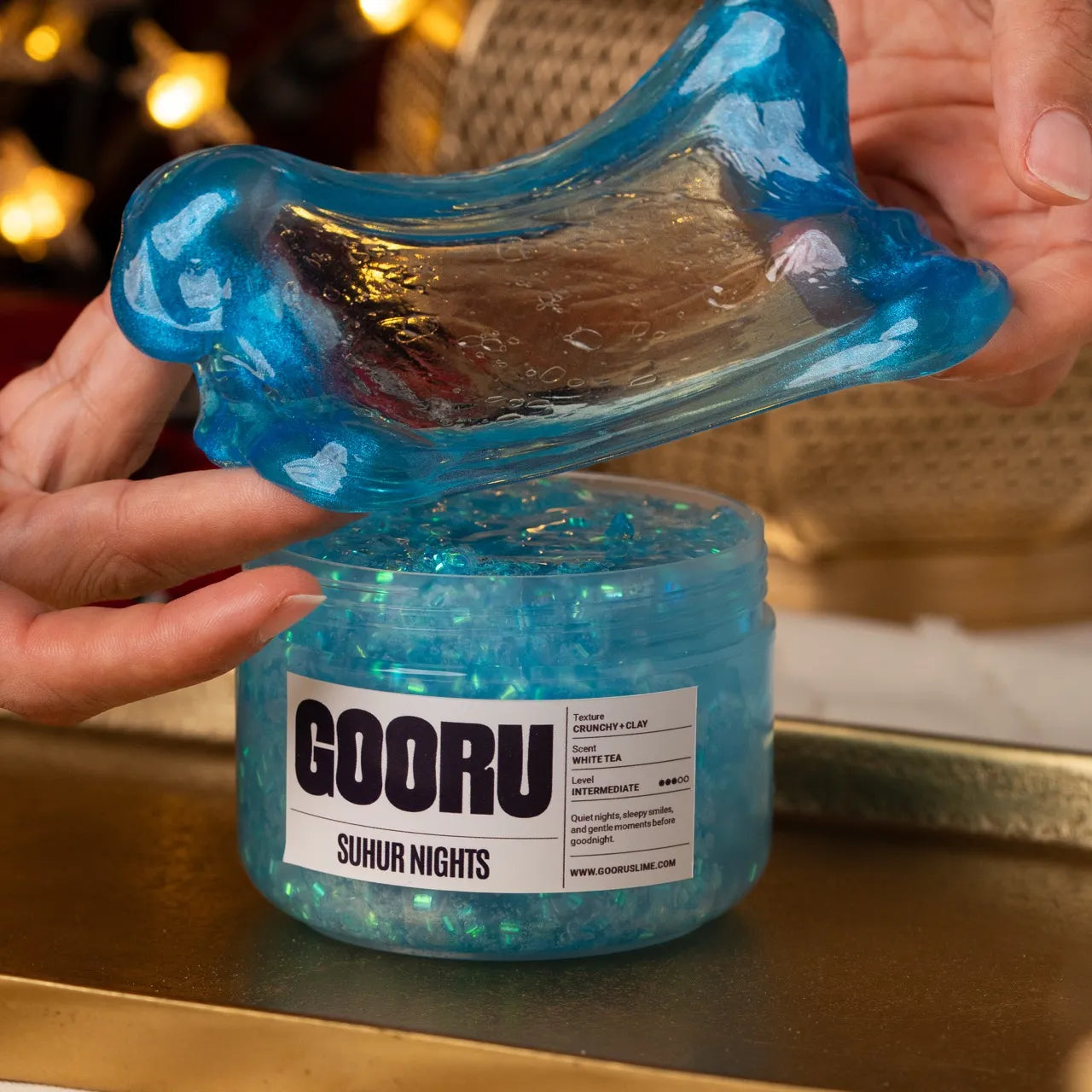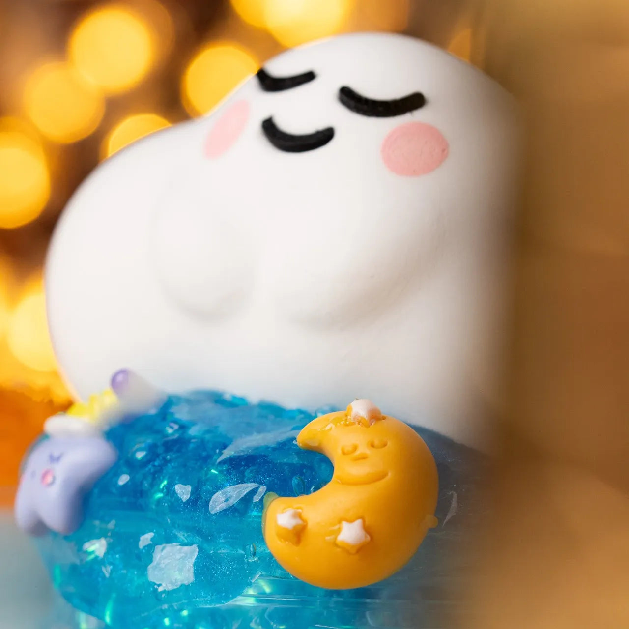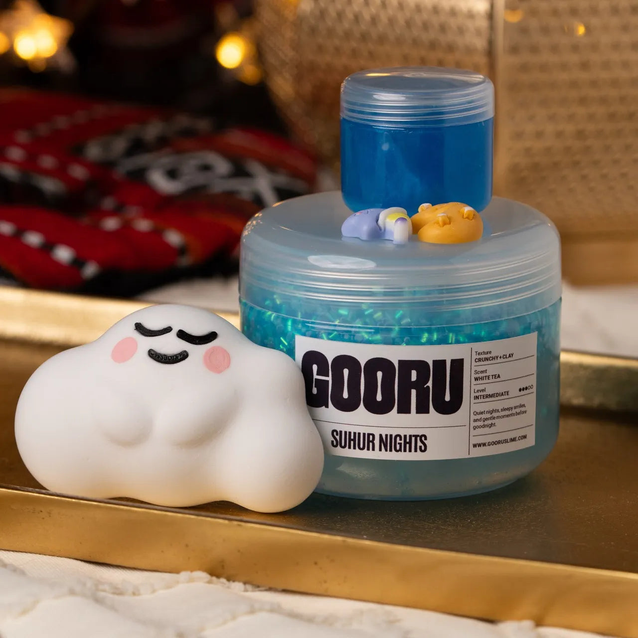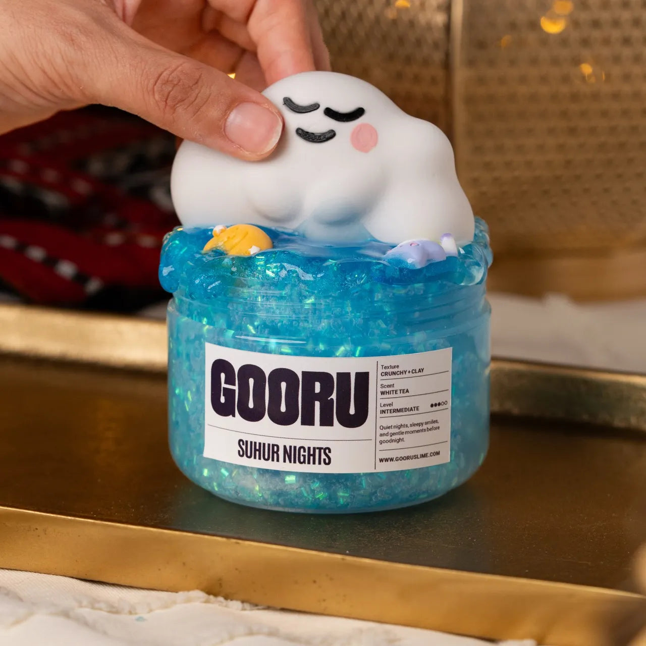 Suhur Nights is a crunchy and clay slime with white tea scent and dreamy suhoor-inspired toppers.