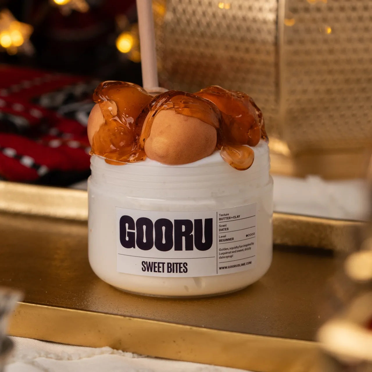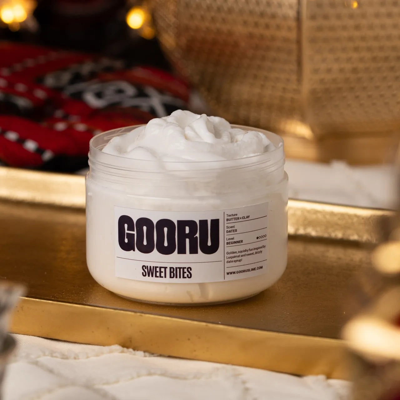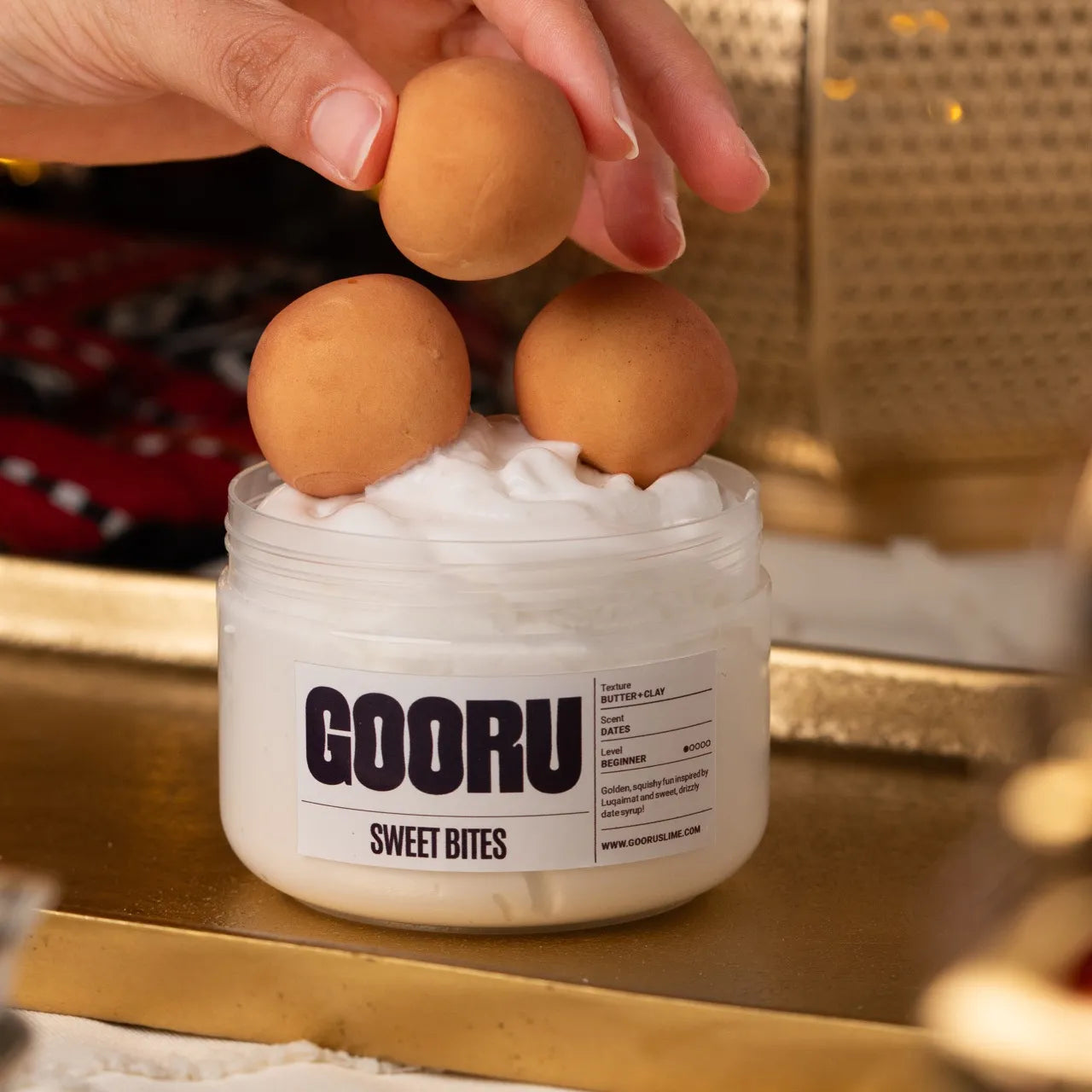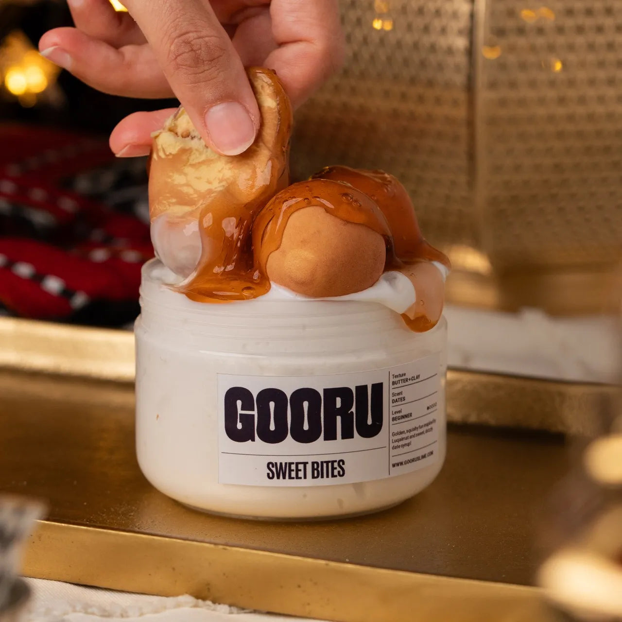 Sweet Bites is a butter and clay slime scented like dates, inspired by luqaimat and Eid treats.