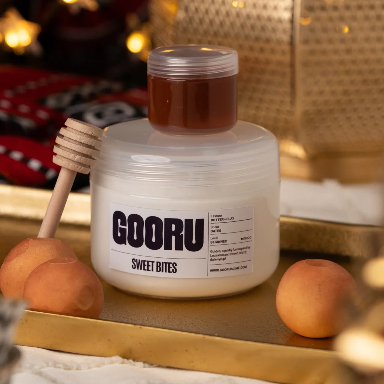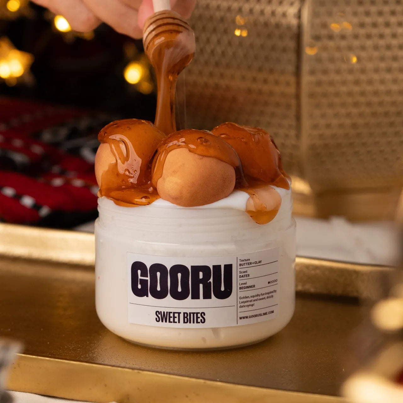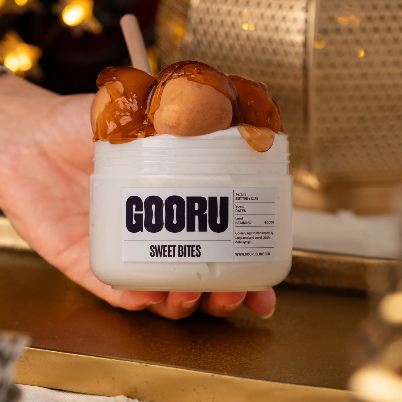 Sweet Bites is a butter and clay slime scented like dates, inspired by luqaimat and Eid treats.